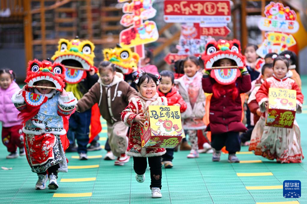 12月31日,江苏南京建邺区金地名京幼儿园的孩子们开展新年祝福活动。