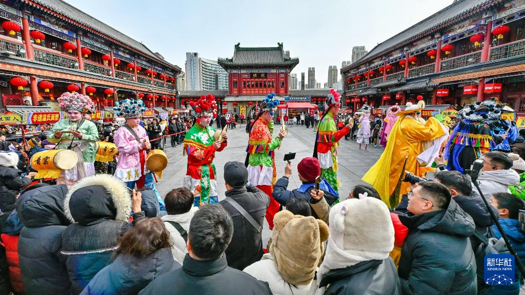 2月15日,游客在天津古文化街观看民俗表演。
