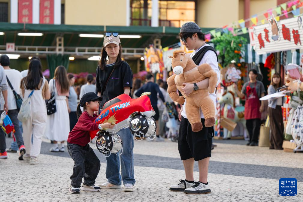 2月15日,小朋友在澳门塔石广场年宵市场游玩。