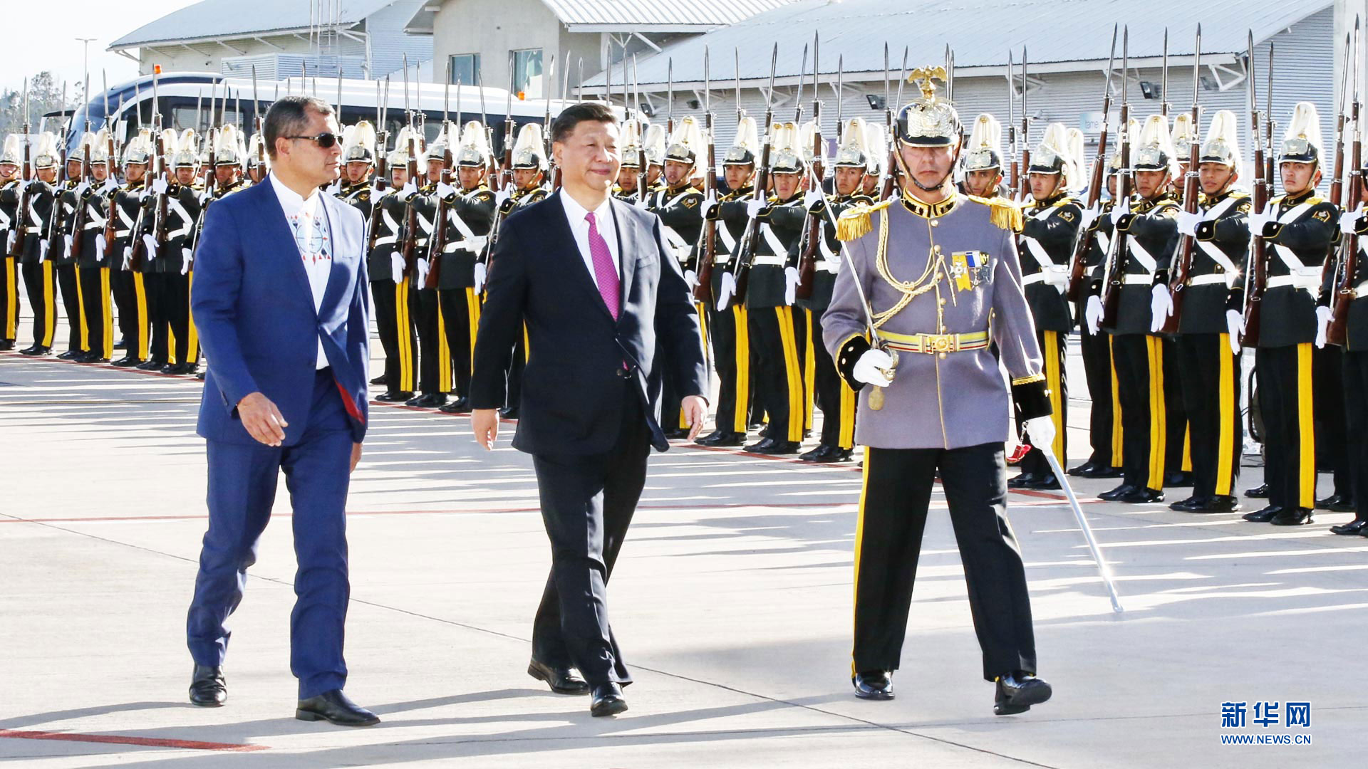 11月22日,國家主席習(xí)近平在圣地亞哥同智利總統(tǒng)巴切萊特舉行會(huì)談。這是會(huì)談前,習(xí)近平出席巴切萊特在憲法廣場舉行的隆重歡迎儀式。新華社記者 王曄 攝2016-11-23