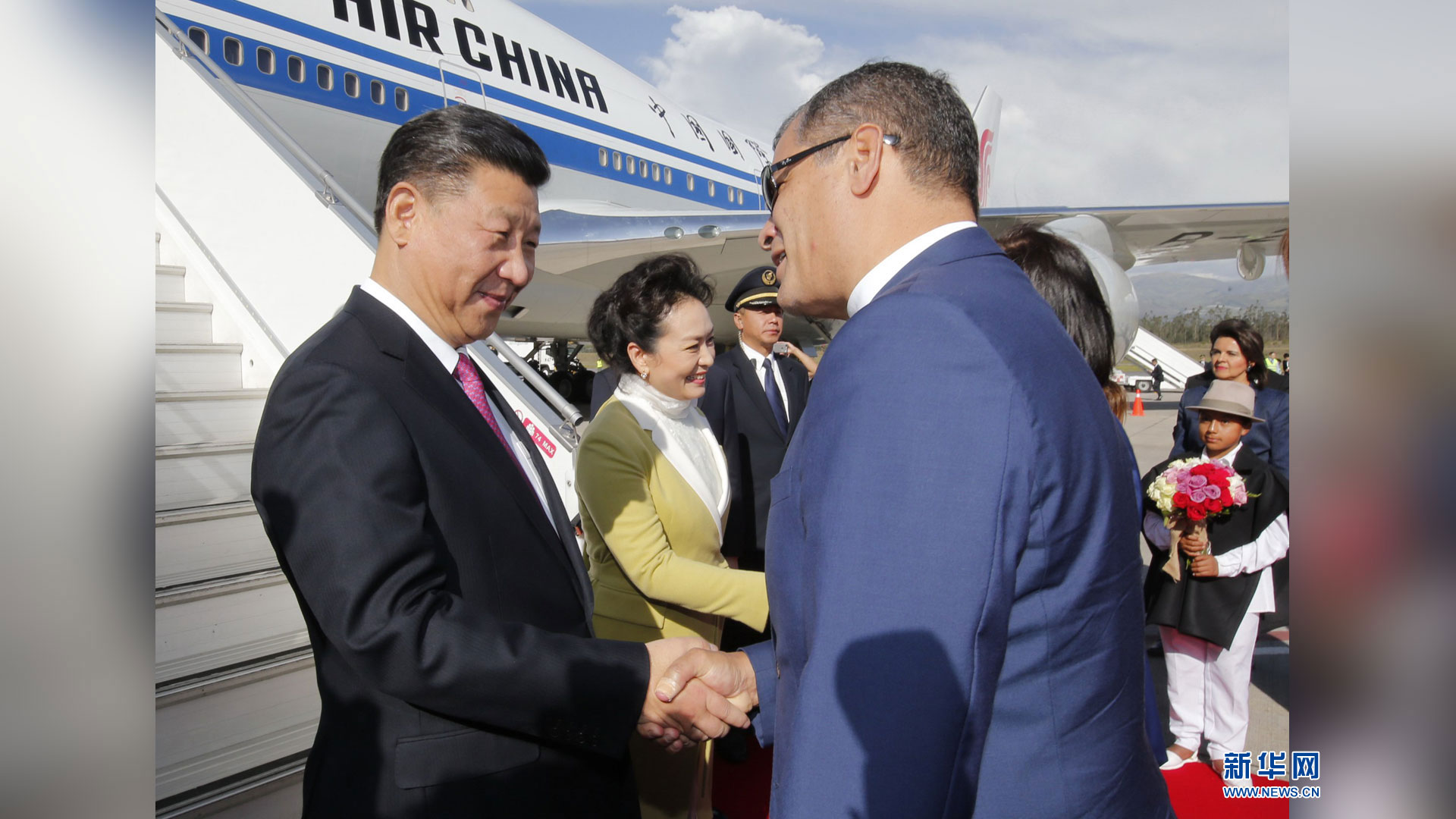 當(dāng)?shù)貢r(shí)間11月17日,國家主席習(xí)近平乘專機(jī)抵達(dá)基多,開始對厄瓜多爾共和國進(jìn)行國事訪問。厄瓜多爾總統(tǒng)科雷亞和夫人馬勒布等在舷梯旁熱情迎接習(xí)近平和夫人彭麗媛。新華社記者 鞠鵬 攝2016-11-18