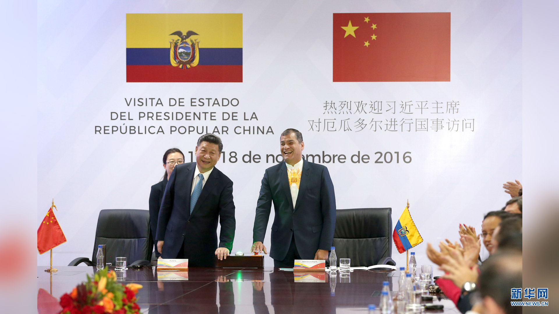 當(dāng)?shù)貢r(shí)間11月17日,國家主席習(xí)近平在基多同厄瓜多爾總統(tǒng)科雷亞舉行會(huì)談。這是會(huì)談后,兩國元首見證雙邊合作文件的簽署。 新華社記者 鞠鵬攝2016-11-18