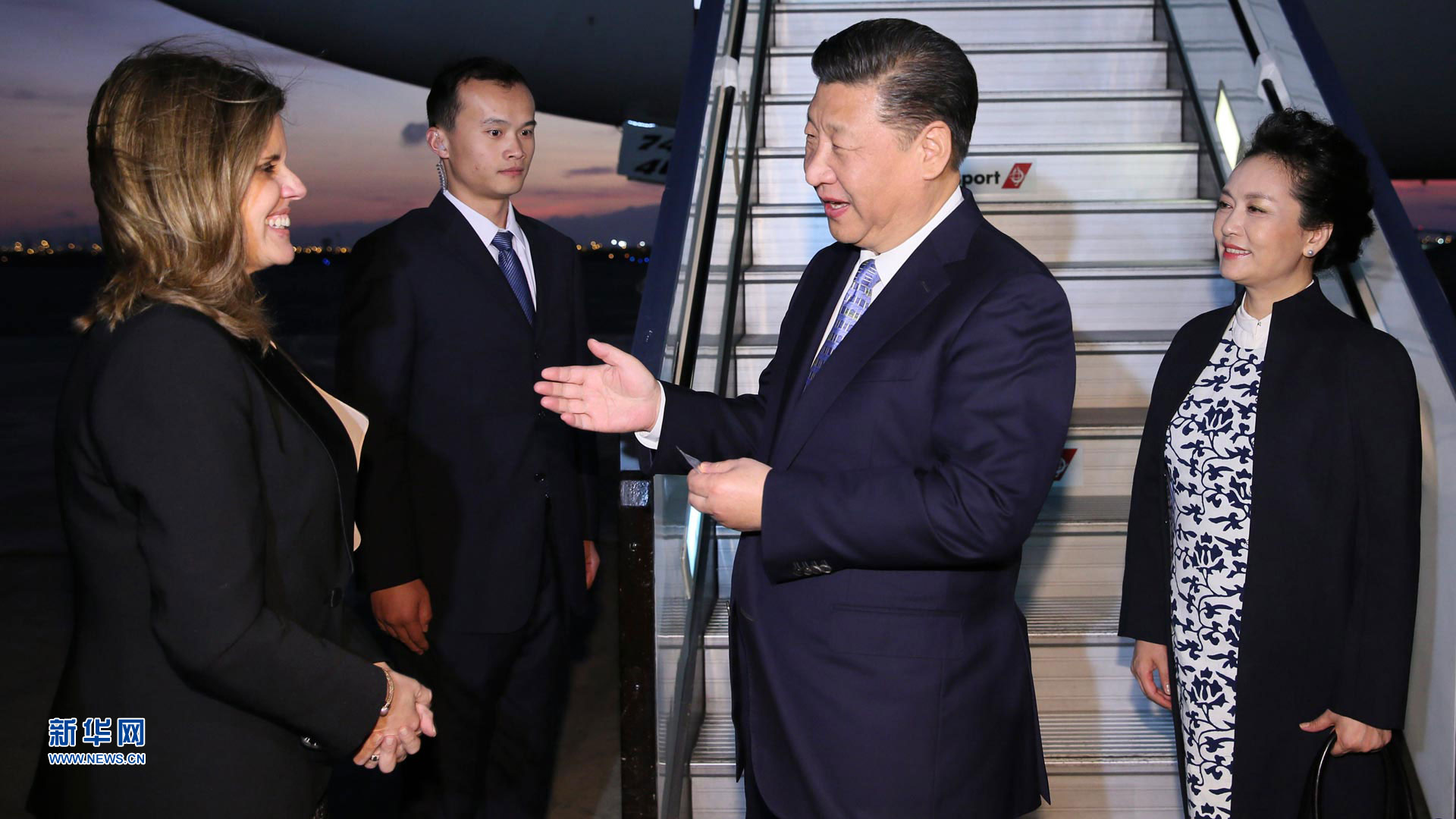 11月22日,國家主席習(xí)近平抵達(dá)圣地亞哥,對智利共和國進(jìn)行國事訪問。智利外長穆尼奧斯等在機(jī)場迎接習(xí)近平和夫人彭麗媛。 新華社記者蘭紅光 攝2016-11-23