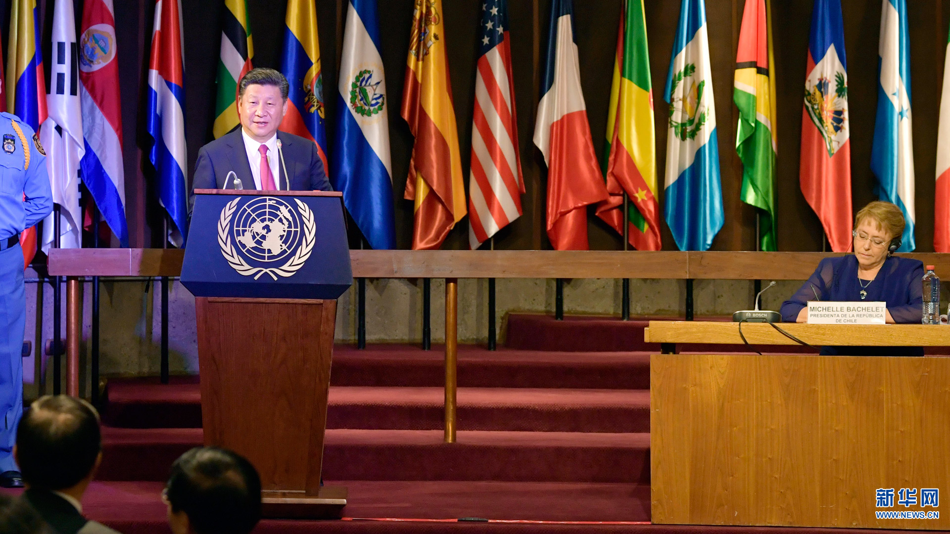 11月22日,國家主席習(xí)近平在圣地亞哥聯(lián)合國拉丁美洲和加勒比經(jīng)濟(jì)委員會(huì)總部出席中拉媒體領(lǐng)袖峰會(huì)開幕式。智利總統(tǒng)巴切萊特陪同出席。在熱烈的掌聲中,習(xí)近平發(fā)表題為《開創(chuàng)中拉媒體合作新局面》的致辭。新華社記者 王曄 攝2016-11-23