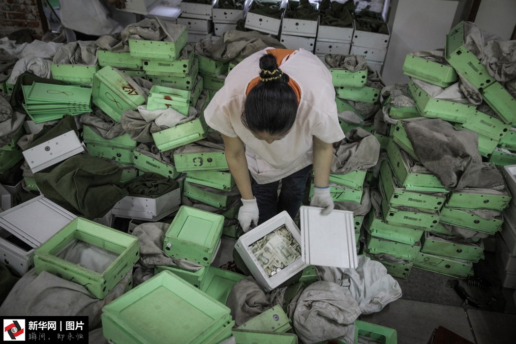 點(diǎn)鈔中心的員工在修補(bǔ)殘破的人民幣。