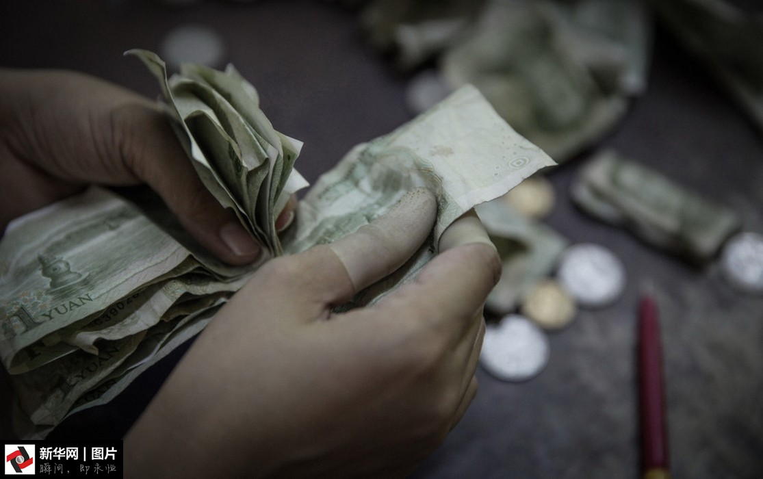 圖為帶著橡膠指套的點(diǎn)鈔工在點(diǎn)鈔。