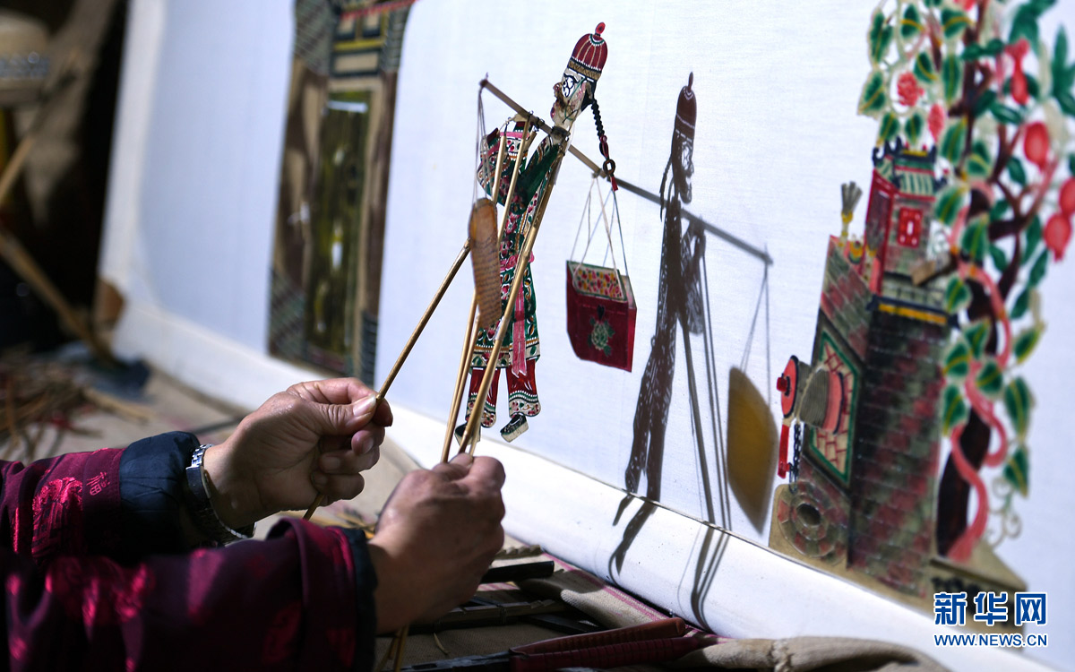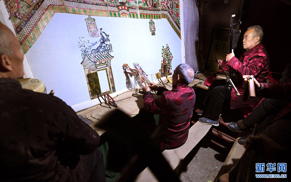 1月10日,在華州皮影文化園,皮影老藝人為觀眾表演皮影戲。