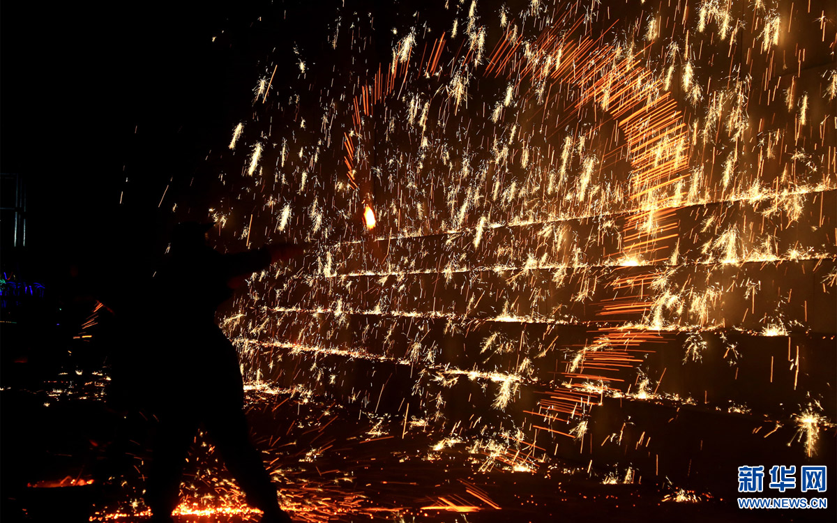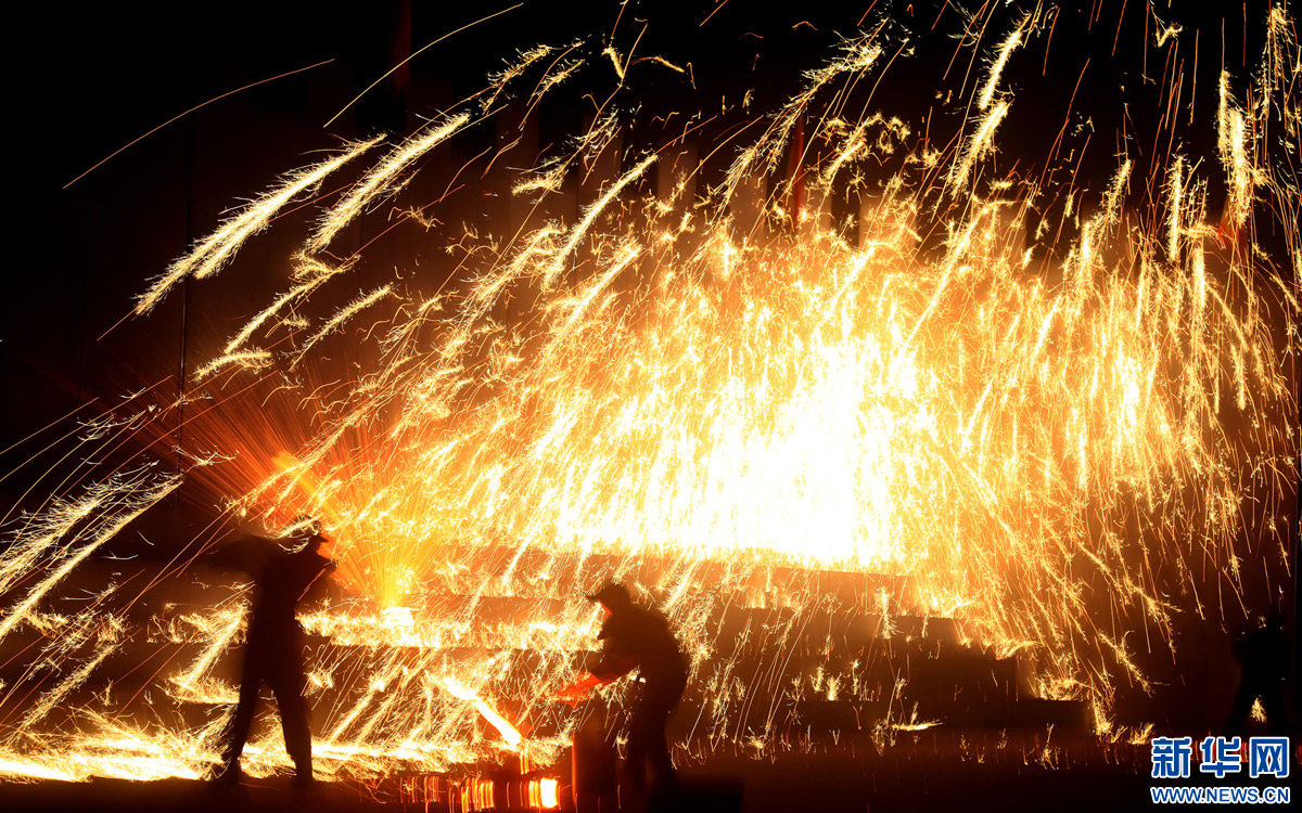 1月12日,磁縣本地匠人在“打鐵花”。當日,河北磁縣開始舉行“打鐵花”慶新年活動?!按蜩F花”是以小煉鐵爐將生鐵化成鐵水后,用木板將鐵水加鋸末打上天空,鋸末在空中燃燒形成“鐵花火雨”四濺飛揚的景象。打鐵花”是當地歷史悠久的民俗娛樂活動。新華社發 (趙鴻宇攝)