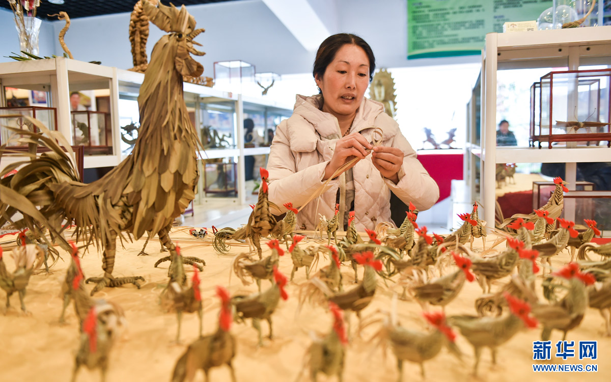 1月15日,洛陽棕編藝人賈淑娟修剪“金雞”棕編作品。為迎接雞年到來,河南洛陽棕編藝人賈淑娟歷時一個月創作出近百只活靈活現的“金雞”棕編作品,制作工序包括棕櫚葉的選材、熏蒸、陰晾、編制、組合、粘貼等。新華社發(黃政偉 攝)