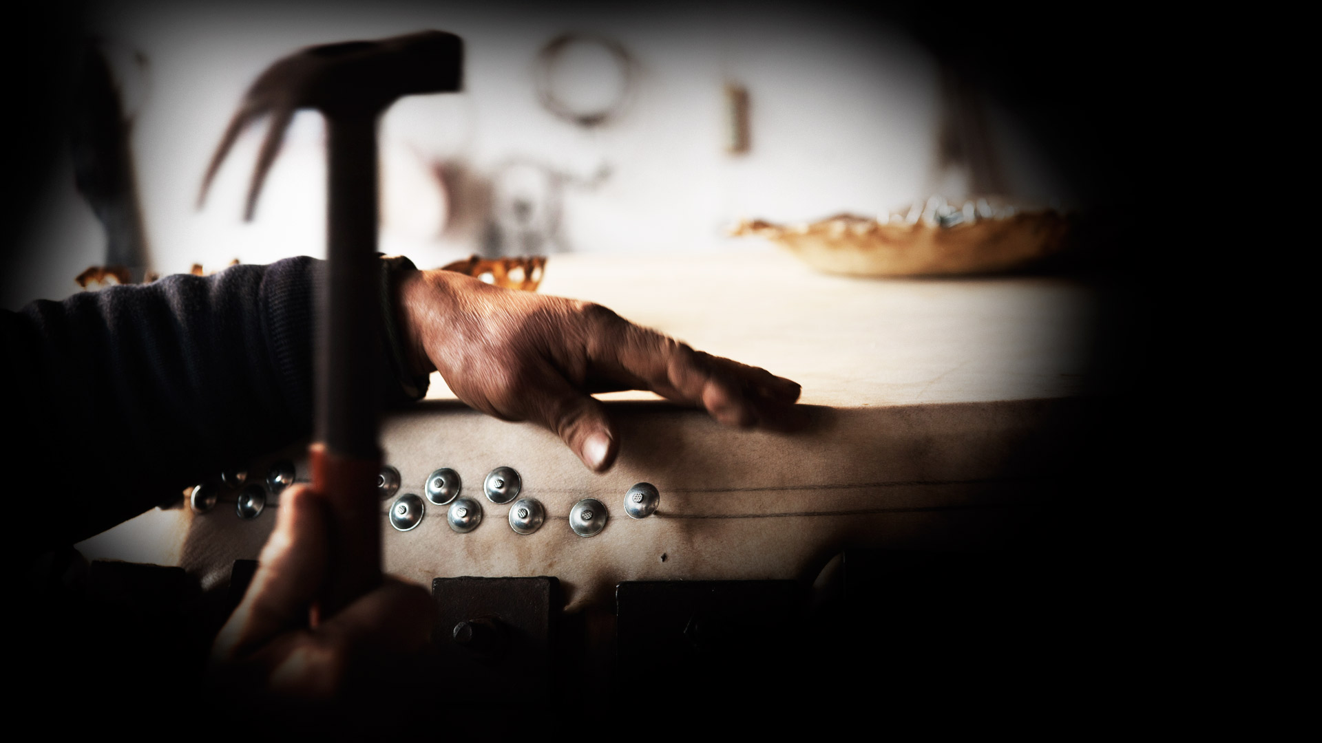1月17日,在藁城黃家莊河北名華樂器制作有限公司內,工人正在釘釘子固定鼓皮。河北石家莊藁城戰鼓表演及其制作工藝,2016年被評為河北省級非物質文化遺產。據藁城戰鼓的傳承人胡造寶介紹,藁城戰鼓源自架鼓,在清末時吸收了武術動作,演變成了戰鼓。藁城戰鼓表演時配合鑼、鈸一起演奏,鼓點激昂,讓人振奮。藁城戰鼓需經過挖鼓幫、蒙鼓皮、踩鼓等近二十道工序,平均耗時十天左右才能制作完成。新華社發(蒲東峰 攝)