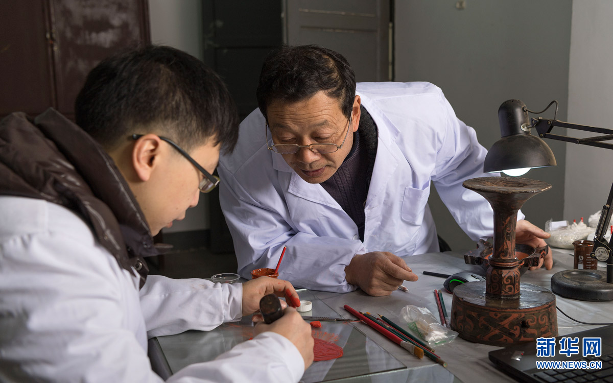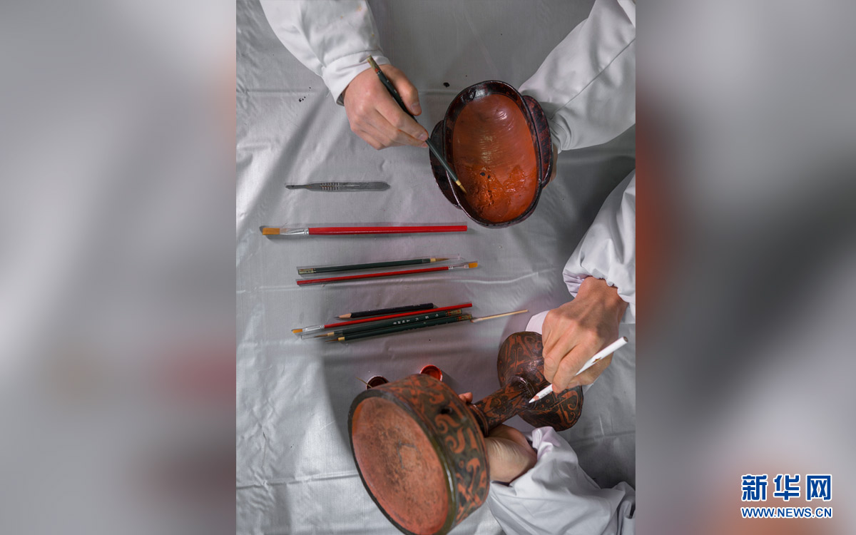 1月10日,杜道子(下)和同事在修復竹木漆器文物。年過六旬的杜道子是湖北省荊州文物保護中心的竹木漆器文物修復專家、楚式漆器修復技藝傳承人。原本褪色、破損、殘缺的竹木漆器,經過他的修復,都能重放光彩,再現當年的神韻。杜道子從小便接觸學習繪畫、木雕,后來學習工藝美術專業的他開始從事傳統美術設計工作。1987年,杜道子作為專業性人才被引進荊州博物館,從此開始正式進入竹木漆器修復行業。至今他從事竹木漆器文物修復工作已30年。在此期間,杜道子修復的竹木漆器文物超過兩千件,其中包括荊州出土的虎座鳳架鼓、湖南長沙馬王堆出土的朱地彩繪棺等國家重點文物。荊州文物保護中心的竹木漆器文物修復水平在全國領先,每年都有大量全國各地的竹木漆器文物送來進行修復。這些送修文物病害各不相同,修復工藝繁瑣,從清洗、脫水、干燥,到髹漆、彩繪、封護等等,要進行十幾個步驟才能讓沉睡的文物“復活”。杜道子說:“文物修復是一門藝術,琢磨久了,同手里的竹木漆器間也像有了對話一般,通過不同的漆面、紋理,就能琢磨出這件文物在千年前的用途和使用環境??吹揭患衲酒崞髟谧约菏掷镏孬@‘新生’,一種自豪感便會油然而生?!?新華社發(熊琦 攝)