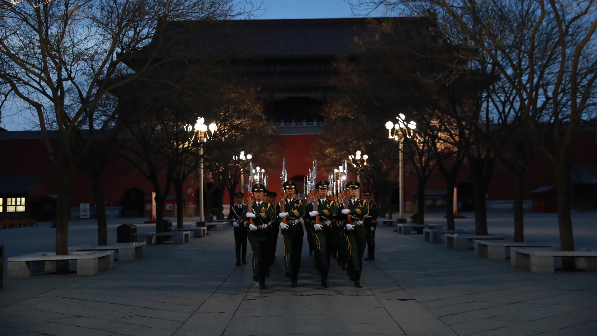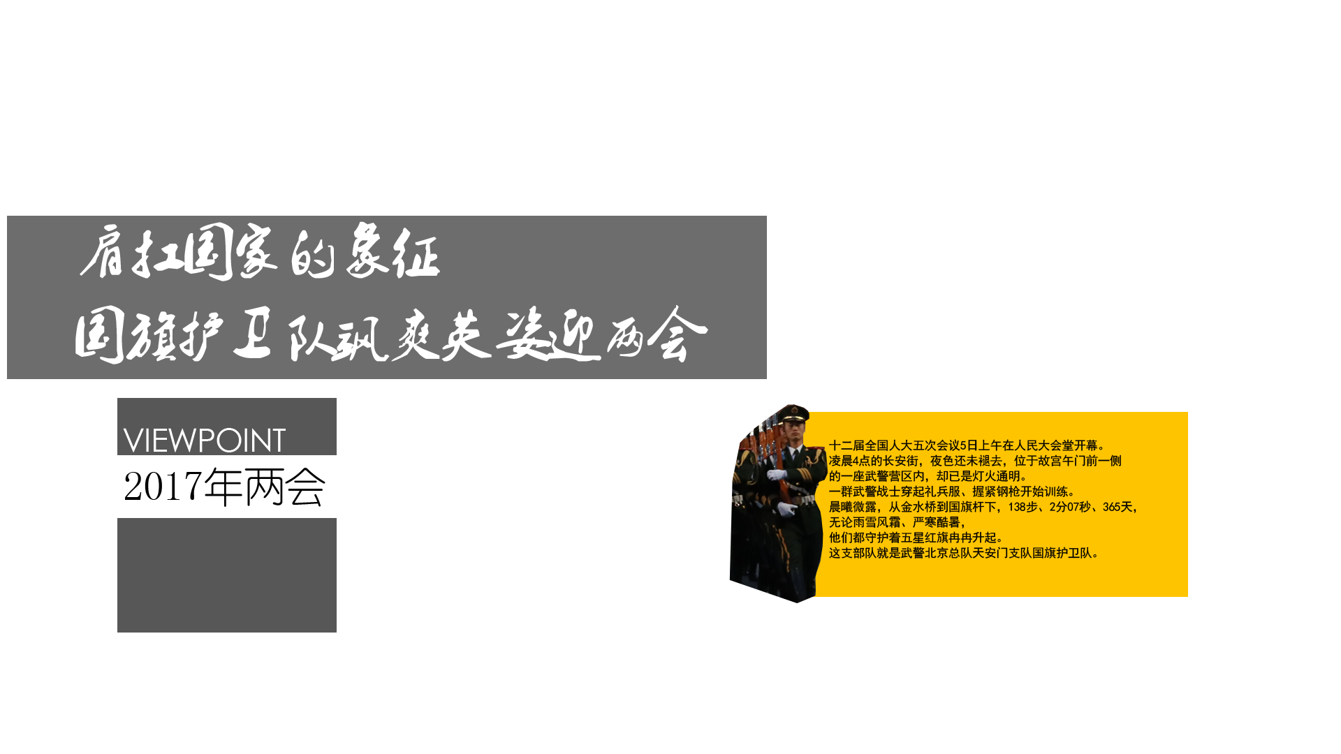 2017年3月5日,第十二屆全國人民代表大會(huì)第五次會(huì)議在人民大會(huì)堂開幕。凌晨4點(diǎn)的長安街,夜色還未褪去,位于故宮午門前一側(cè)的一座武警營區(qū)內(nèi),卻已是燈火通明。一群武警戰(zhàn)士穿起禮兵服、握緊鋼槍開始訓(xùn)練。晨曦微露,從金水橋到國旗桿下,138步、2分07秒、365天,無論雨雪風(fēng)霜、嚴(yán)寒酷暑,他們都守護(hù)著五星紅旗冉冉升起。這支部隊(duì)就是武警北京總隊(duì)天安門支隊(duì)國旗護(hù)衛(wèi)隊(duì)。