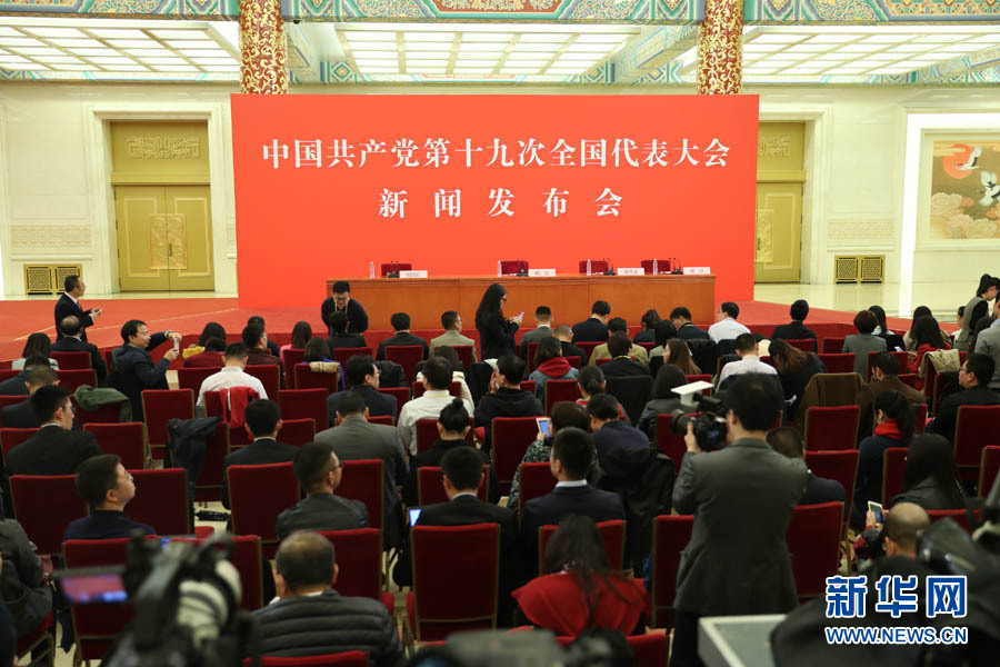 2017年10月17日下午,中國共產黨第十九次全國代表大會新聞發言人在人民大會堂三樓金色大廳舉行新聞發布會,并回答中外記者提問。圖為新聞發布會現場。新華網 翟子赫 攝