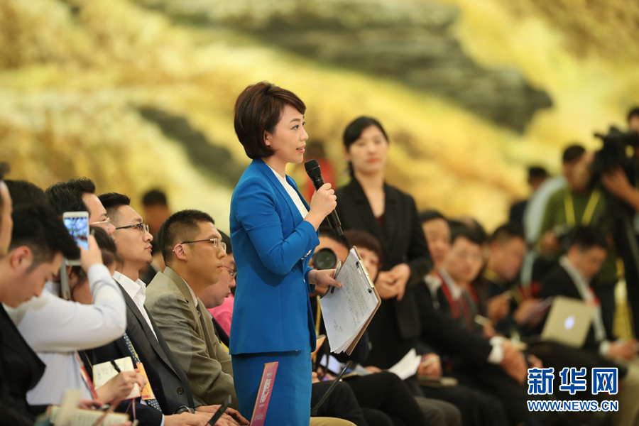 2017年10月17日下午,中國共產黨第十九次全國代表大會新聞發言人在人民大會堂三樓金色大廳舉行新聞發布會,并回答中外記者提問。圖為中央電視臺記者提問。新華網 翟子赫 攝