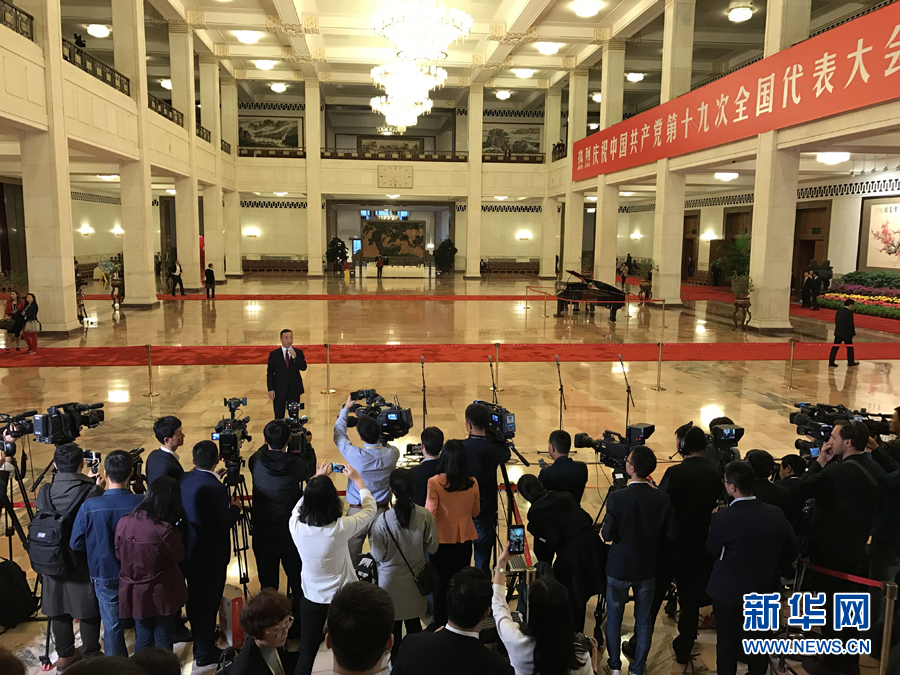 10月18日,十九大新聞中心在人民大會堂舉辦“黨代表通道”第一場采訪活動。圖為采訪現場。新華網 翟子赫攝