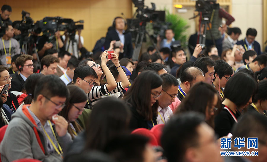 10月23日,十九大新聞中心舉辦記者招待會,邀請中央財經領導小組辦公室副主任楊偉民,環境保護部黨組書記、部長李干杰介紹踐行綠色發展理念,建設美麗中國有關情況,并回答記者提問。圖為現場記者。新華網 郝廣鵬攝