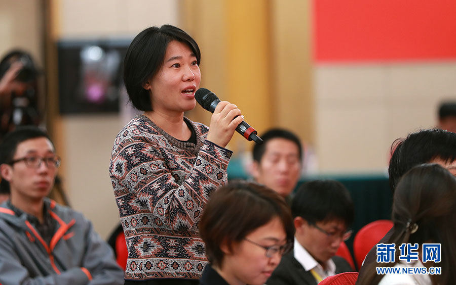 10月23日,十九大新聞中心舉辦集體采訪活動,主題為“打好生態環保攻堅戰”。圖為中國海洋報記者提問。新華網 郝廣鵬攝