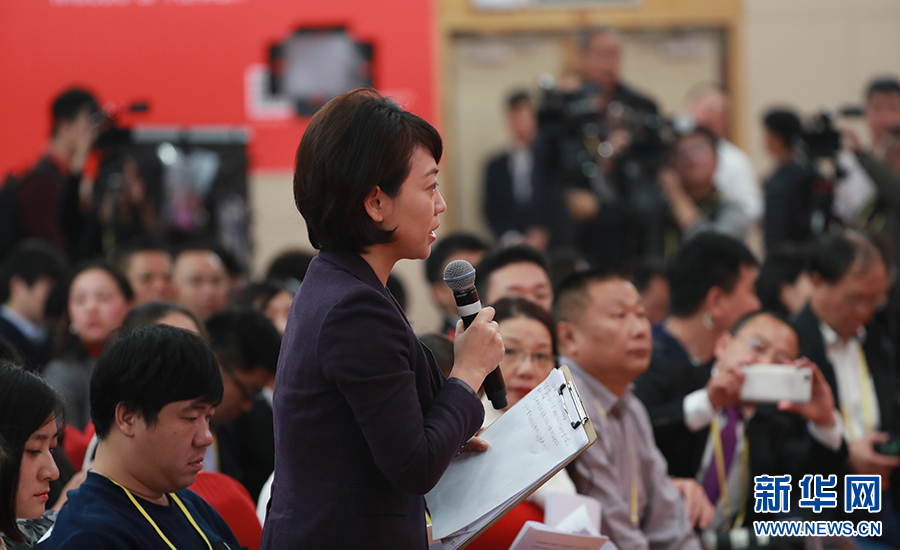 10月26日上午10:00,中國共產(chǎn)黨第十九次全國代表大會新聞發(fā)言人在梅地亞賓館二層新聞發(fā)布廳召開專題新聞發(fā)布會,請有關(guān)方面負責(zé)人解讀十九大報告,并回答記者關(guān)心的問題。圖為中央電視臺記者提問。新華網(wǎng) 翟子赫 攝