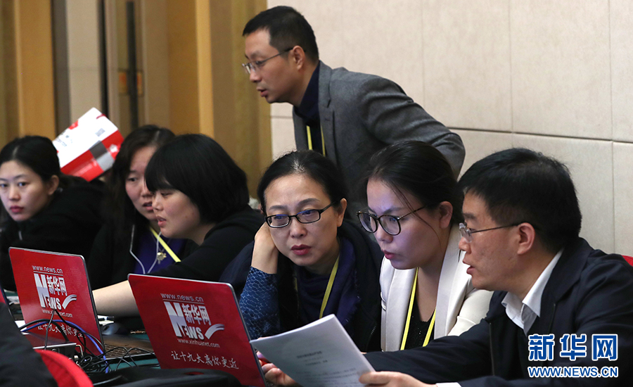 10月26日上午10:00,中國共產黨第十九次全國代表大會新聞發言人在梅地亞賓館二層新聞發布廳召開專題新聞發布會,請有關方面負責人解讀十九大報告,并回答記者關心的問題。圖為新華網在現場直播。新華網?翟子赫 攝
