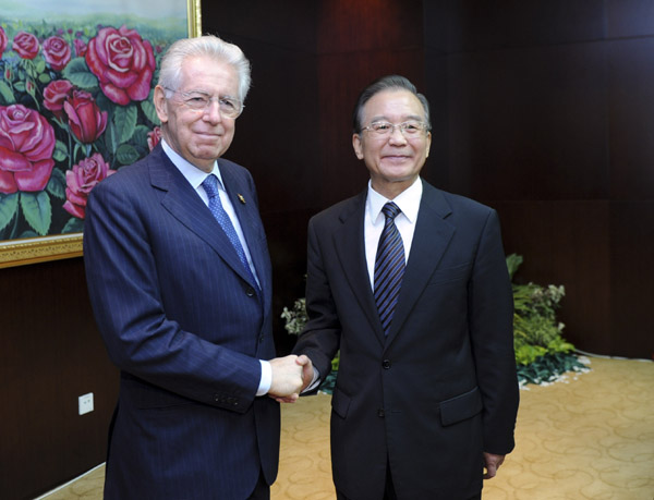 ????在會見蒙蒂時,溫家寶表示,一段時間以來,歐盟采取了若干重大舉措應對歐債問題,意大利積極推進財政改革和經濟振興計劃,這些都讓歐洲和國際社會看到了希望,增添了信心。中方支持歐方作出更有成效的努力,倡議中歐探討在經貿、投資、基礎設施、金融、高科技等領域開展大規模合作。意大利有燦爛的文化和很強的創新能力,在歐盟中發揮著重要影響。中方愿與意方加強協調合作,繼續應對國際金融危機,推動中意、中歐關系取得更大進展。