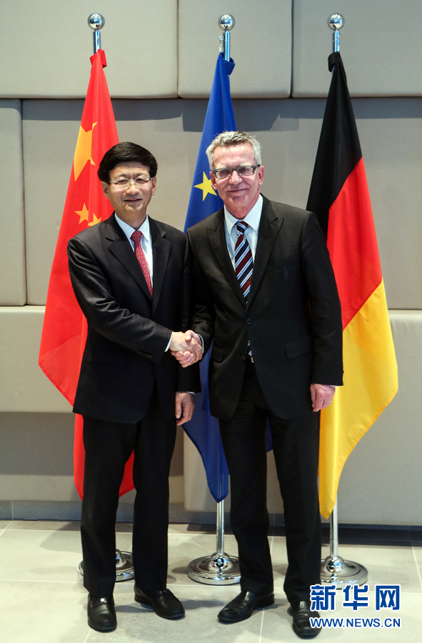 新華社照片,柏林,2015年6月30日 (XHDW)孟建柱會見德國內(nèi)政部長德邁齊埃 6月29日,習(xí)近平主席特使、中共中央政治局委員、中央政法委書記孟建柱(左)在德國首都柏林會見德國內(nèi)政部長德邁齊埃。 新華社記者張帆攝