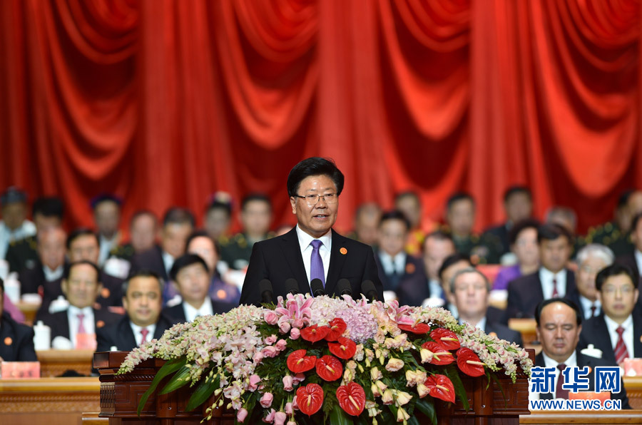 ??? 10月1日,慶祝中華人民共和國成立66周年暨新疆維吾爾自治區成立60周年大會在新疆人民會堂隆重舉行。這是中共中央政治局委員、新疆維吾爾自治區黨委書記、新疆軍區黨委第一書記、新疆生產建設兵團黨委第一書記、第一政委張春賢發表講話。新華網 郭小天 攝
