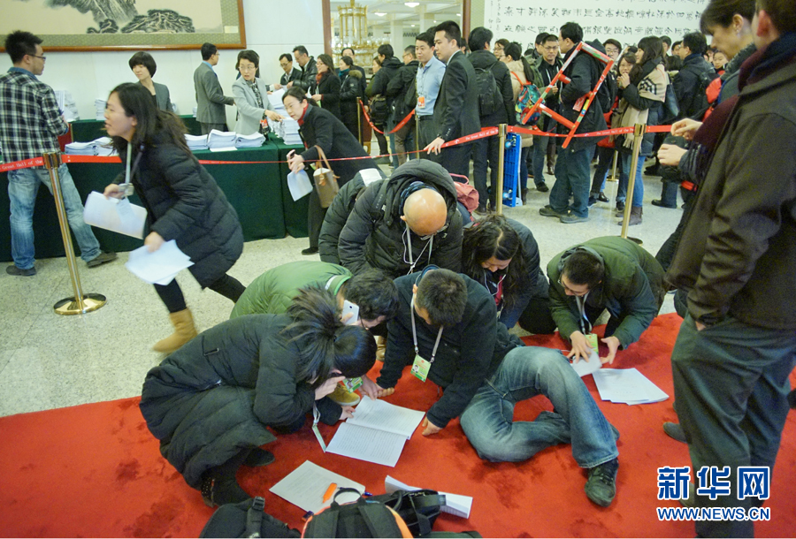 ??? 3月5日,第十二屆全國人民代表大會第三次會議在北京人民大會堂開幕。這是記者在人民大會堂內(nèi)領(lǐng)到政府工作報(bào)告后抓緊閱讀。新華網(wǎng)/中國政府網(wǎng) 郭小天攝