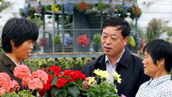 武繼軍(中)和花農(nóng)交流花卉培育經(jīng)驗。