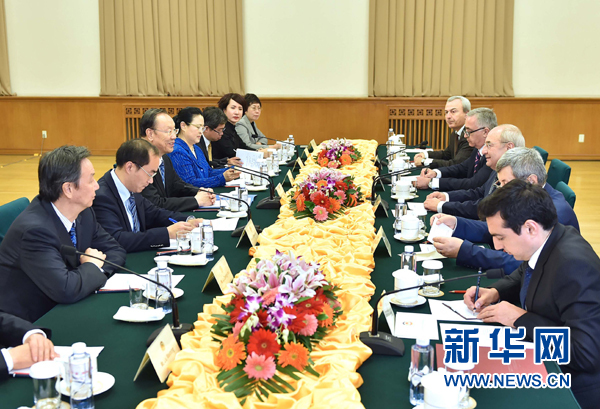 11月3日,中共中央書(shū)記處書(shū)記、全國(guó)政協(xié)副主席、中國(guó)經(jīng)濟(jì)社會(huì)理事會(huì)主席杜青林在北京與亞美尼亞公眾院主席馬努基揚(yáng)會(huì)談。 新華社記者 李濤攝