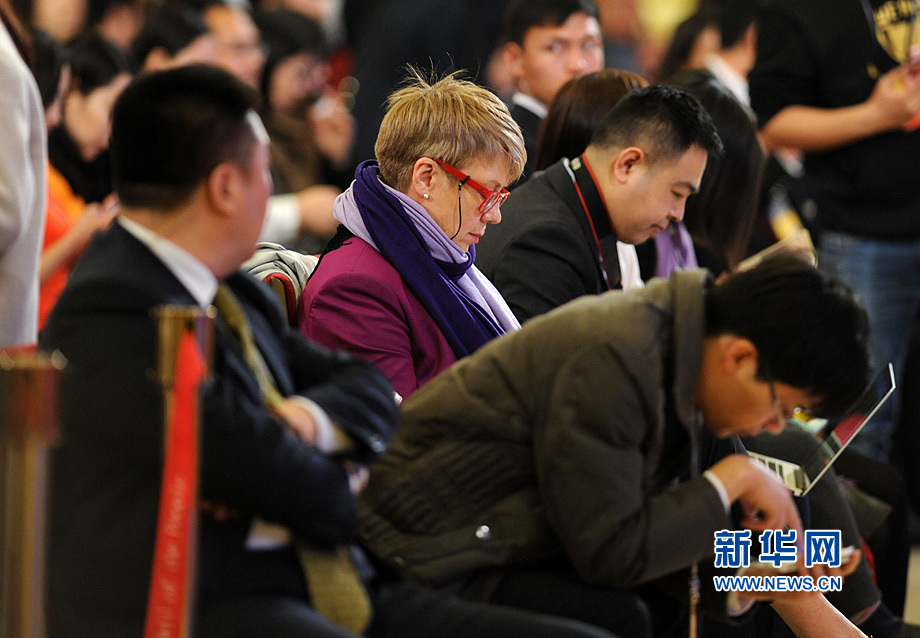 3月16日上午,國務院總理李克強在人民大會堂三樓金色大廳會見采訪十二屆全國人大四次會議的中外記者并回答記者提出的問題。圖為早早趕到記者會現場的各路媒體記者。新華網/中國政府網 陳競超 攝