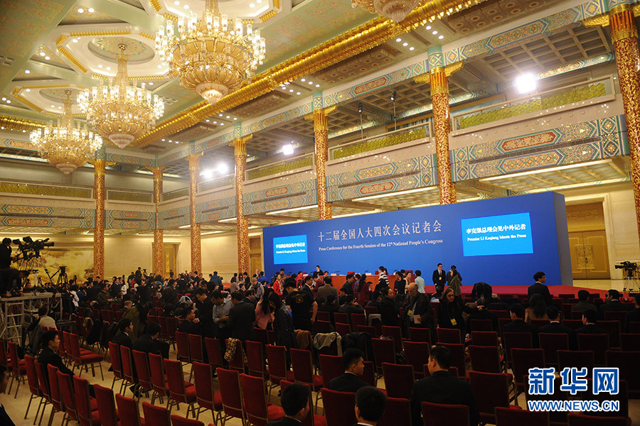 3月16日上午,國(guó)務(wù)院總理李克強(qiáng)在人民大會(huì)堂三樓金色大廳會(huì)見采訪十二屆全國(guó)人大四次會(huì)議的中外記者并回答記者提出的問題。圖為記者在準(zhǔn)備工作。新華網(wǎng)/中國(guó)政府網(wǎng) 陳杰攝