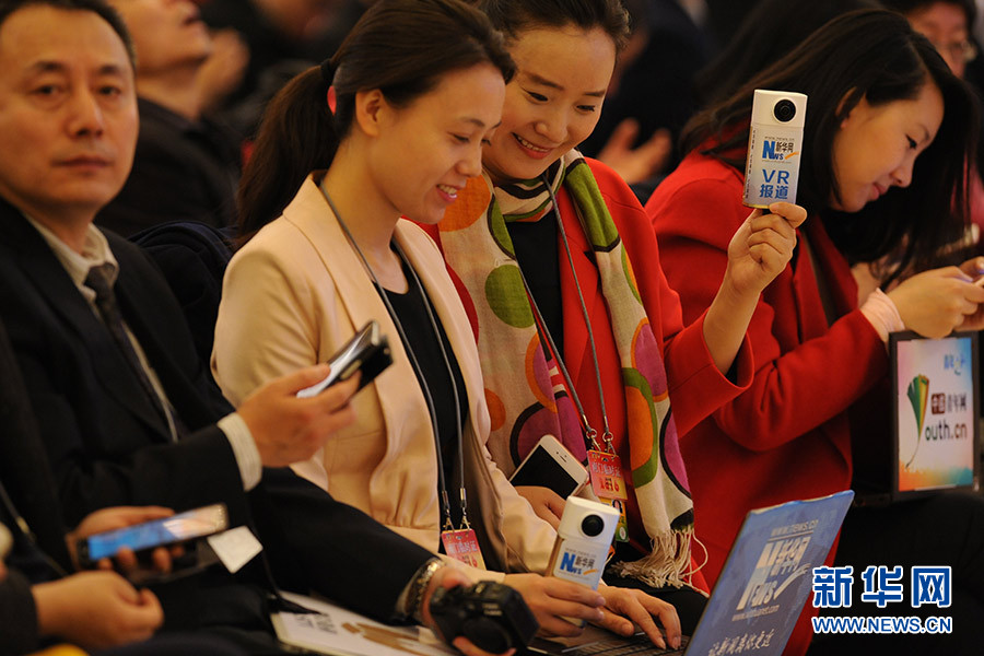 3月16日上午,國務院總理李克強在人民大會堂三樓金色大廳會見采訪十二屆全國人大四次會議的中外記者并回答記者提出的問題。圖為新華網記者用VR報道總理記者會現場。新華網/中國政府網 陳杰攝