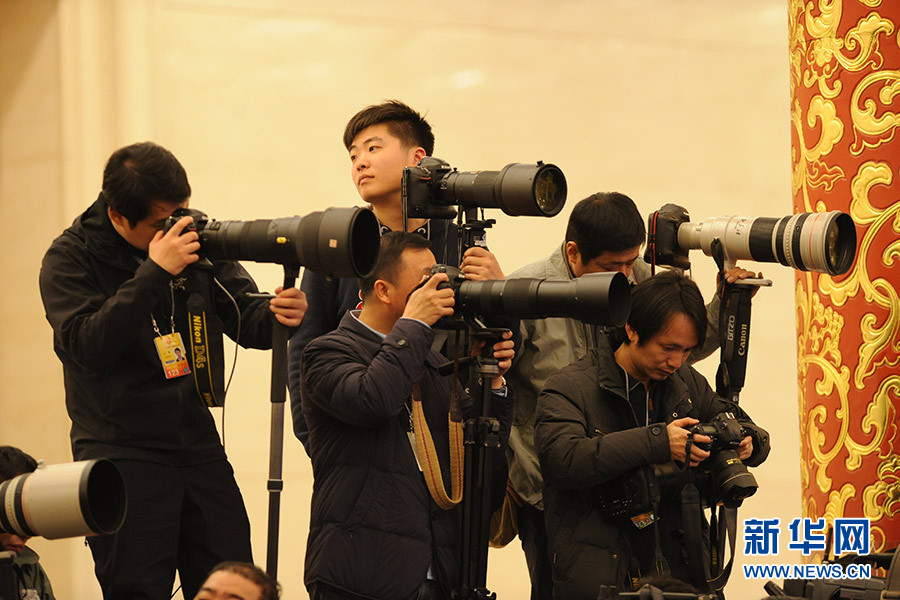 3月16日上午,國務院總理李克強在人民大會堂三樓金色大廳會見采訪十二屆全國人大四次會議的中外記者并回答記者提出的問題。圖為記者會一角的攝影記者。新華網/中國政府網 陳杰攝