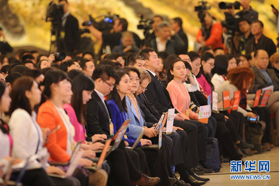 3月16日上午,國務院總理李克強在人民大會堂三樓金色大廳會見采訪十二屆全國人大四次會議的中外記者并回答記者提出的問題。圖為記者會現場。新華網/中國政府網 陳杰攝