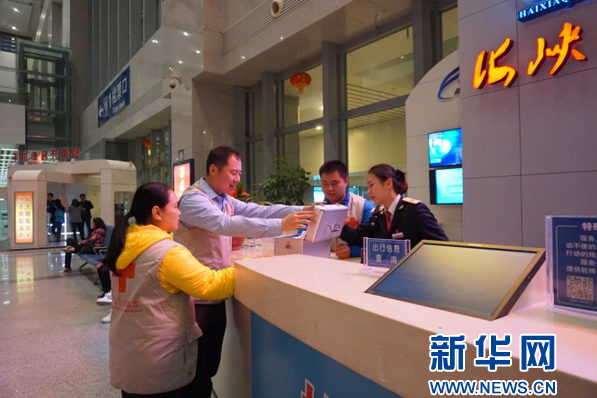 王威在為旅客介紹買票流程。新華網(wǎng) 李海韻 攝