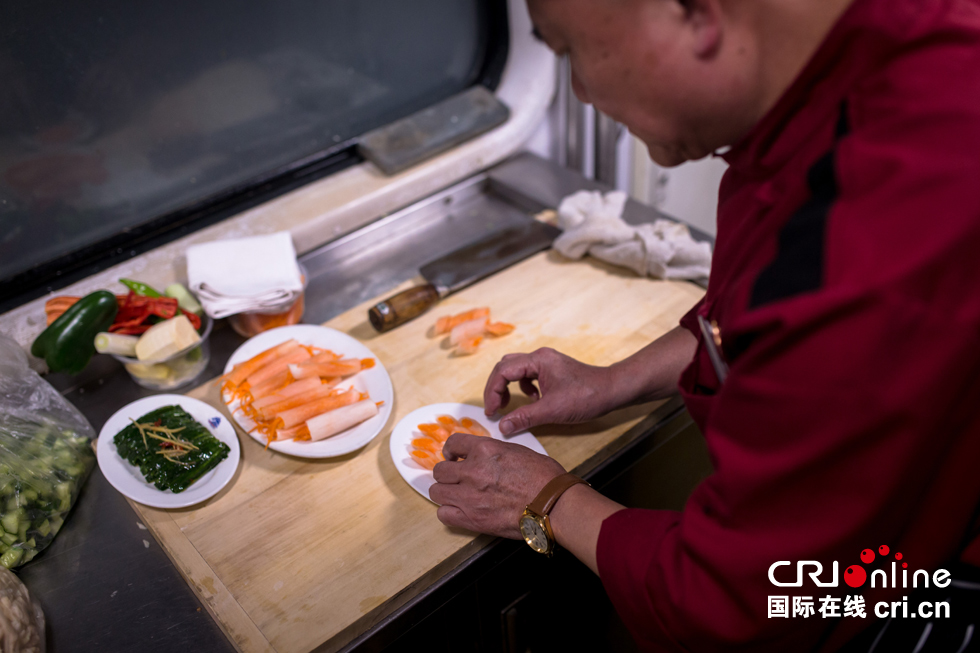 “有一名旅客,差不過每年春運都會坐這趟車從杭州出發前往海寧然后轉乘高鐵前往寧波,為的就是在我們車上吃一頓飯。”白師傅說。圖為白師傅制作菜品。