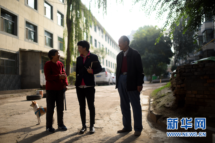 田小紅(中)在青海西寧柴達木路12號小區與老黨員姜福英(左)、倪雪仁交談(9月30日攝)。新華社記者 張宏祥 攝?