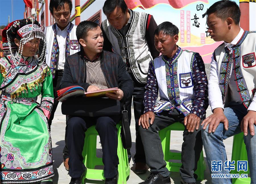 10月31日,十九大代表、貴州省六盤水市鐘山區大灣鎮海嘎村駐村第一書記楊波(前左二)向海嘎村彝族村民宣講十九大精神。新華社記者 劉續 攝