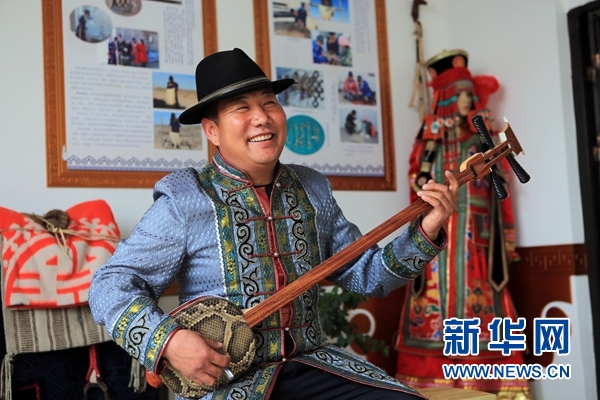 內蒙古鄂爾多斯市鄂托克前旗昂素鎮牧民、黨員中心戶孟克巴雅爾為游客彈唱蒙古族“祝酒歌”(11月6日攝)。新華社記者 王婧嬙 攝