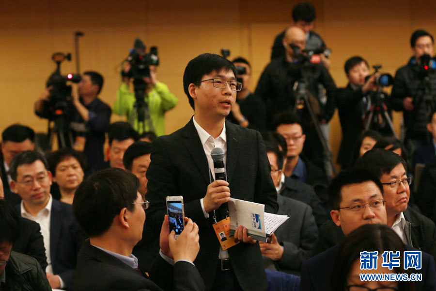 3月14日,十二屆全國人大五次會議新聞中心舉行記者會,邀請國家質檢總局局長支樹平、副局長兼國家認證認可監督管理委員會主任孫大偉、國家標準化管理委員會主任田世宏就“質量提升”的相關問題回答中外記者的提問。圖為湖北衛視記者提問。新華網/中國政府網 傅義洲 攝?