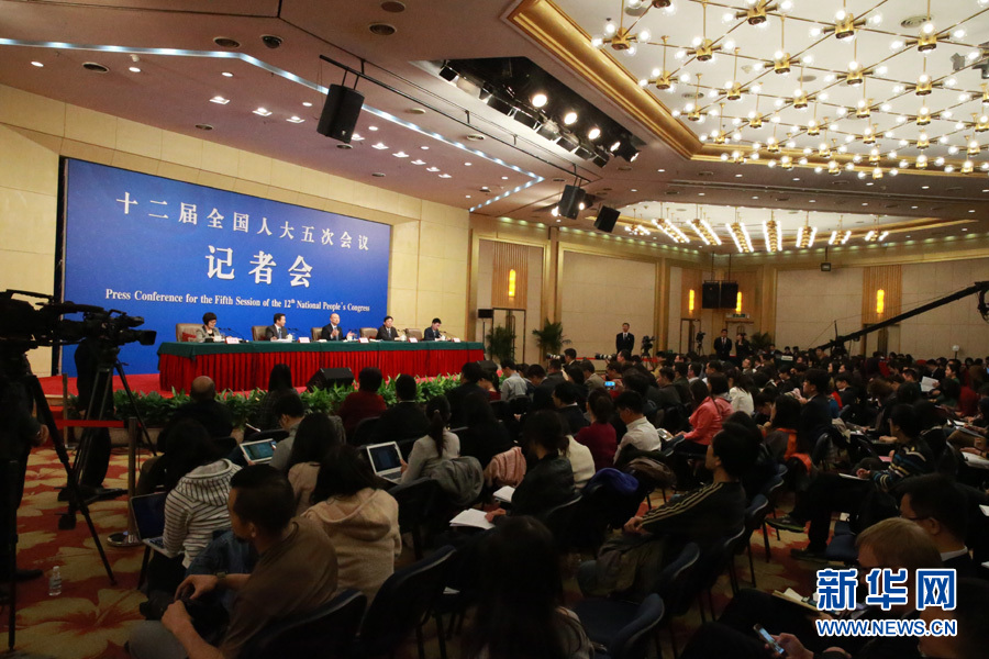 3月14日,十二屆全國人大五次會議新聞中心舉行記者會,邀請國家質檢總局局長支樹平、副局長兼國家認證認可監督管理委員會主任孫大偉、國家標準化管理委員會主任田世宏就“質量提升”的相關問題回答中外記者的提問。圖為記者會現場。新華網/中國政府網 傅義洲 攝