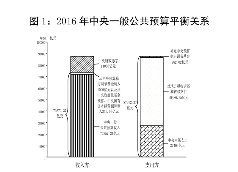中央一般公共預(yù)算收入72357.31億元,為調(diào)整預(yù)算的100%,比2015年同口徑增長1.2%。加上從中央預(yù)算穩(wěn)定調(diào)節(jié)基金調(diào)入1000億元,從中央政府性基金預(yù)算、中央國有資本經(jīng)營預(yù)算調(diào)入315.06億元,收入總量為73672.37億元。中央一般公共預(yù)算支出86890.35億元(其中,中央本級支出27404億元,中央對地方稅收返還和轉(zhuǎn)移支付59486.35億元),完成調(diào)整預(yù)算的99.1%,增長4.5%。加上補(bǔ)充中央預(yù)算穩(wěn)定調(diào)節(jié)基金782.02億元,支出總量為87672.37億元。收支總量相抵,中央財政赤字14000億元,與預(yù)算持平。2016年中央預(yù)備費(fèi)預(yù)算500億元,實(shí)際支出146.1億元,剩余353.9億元全部轉(zhuǎn)入中央預(yù)算穩(wěn)定調(diào)節(jié)基金。2016年末,中央財政國債余額120066.75億元,控制在年度預(yù)算限額125908.35億元以內(nèi);中央預(yù)算穩(wěn)定調(diào)節(jié)基金余額2678.06億元(含通過收回中央財政結(jié)轉(zhuǎn)資金補(bǔ)充1501.83億元)。