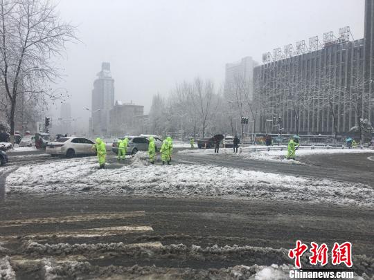 環(huán)衛(wèi)工人在鏟除積雪。 趙強 攝