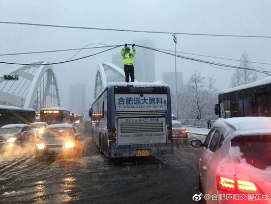 通訊電纜被壓落導(dǎo)致交通癱瘓 執(zhí)勤協(xié)警爬上公交車頂 用雙手托舉電纜線10多分鐘 城管 暖心! 南京城管掃雪打通道路 兩歲小女孩跑過來說“謝謝叔叔” 環(huán)衛(wèi)工人 擰干濕透的襪子