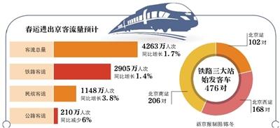 據交通部門預測,2018年春運期間進出京客流總量預計達4263萬人次,同比增長1.7%。其中,鐵路運輸旅客占比近七成,達2905萬人次,同比增長1.4%。此外,民航運輸旅客1148萬人次,同比增長3.8%;公路省際客運運輸旅客210萬人次,同比減少6%。
