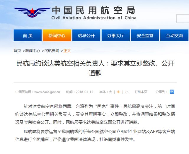 針對達美航空官網將西藏、臺灣列為“國家”事件,民航局高度關注,第一時間約談達美航空公司相關負責人,責令其查明事實,立即整改,并將調查結果和整改情況及時向社會公開。同時,民航局要求達美航空立即公開進行道歉。