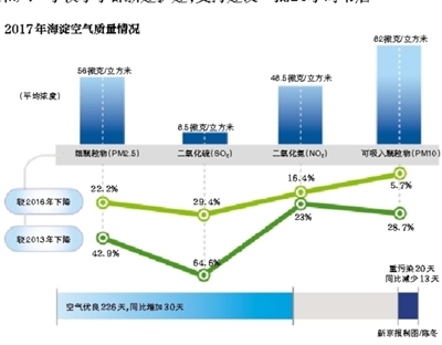 此外,2017年,海淀空氣質量優良天數為226天,占比全年62.3%,較2016年增加30天;重污染天數為20天,較2016年減少13天。