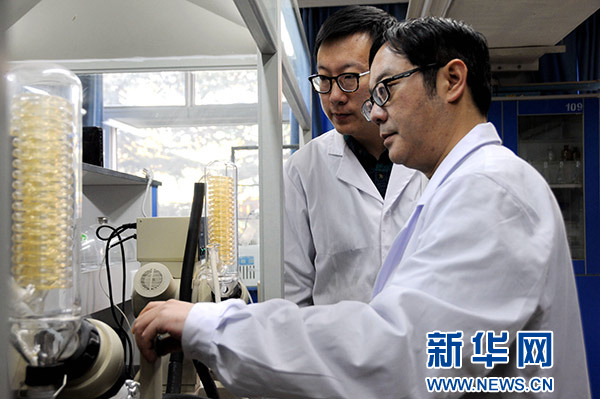 1月19日,蘭州交通大學(xué)天然藥物開(kāi)發(fā)研究所教授沈彤(右)和他的學(xué)生一同進(jìn)行生物農(nóng)藥試驗(yàn)。新華社發(fā)(王銘禹 攝)