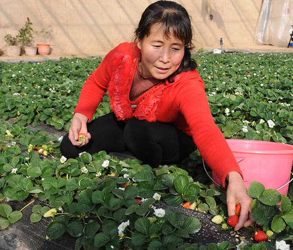 1月19日,甘肅省永靖縣三塬鎮(zhèn)下塬村村民采摘成熟的草莓。新華社發(fā)(王銘禹 攝)