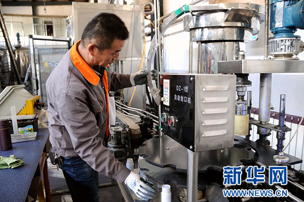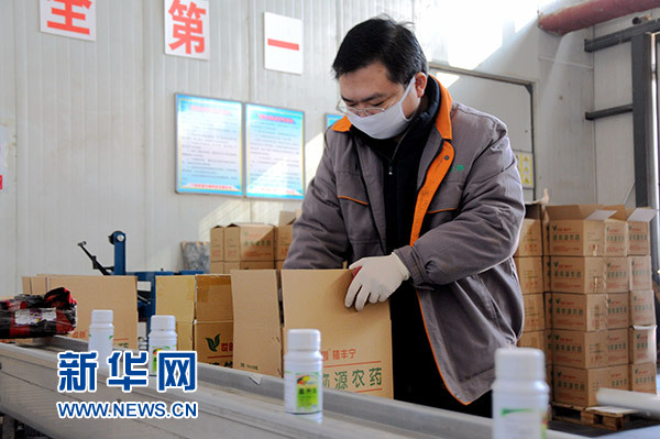 1月19日,在甘肅省植物源生物農(nóng)藥工程技術(shù)研究中心生產(chǎn)車間,工人在包裝生物農(nóng)藥。新華社發(fā)(王銘禹 攝)